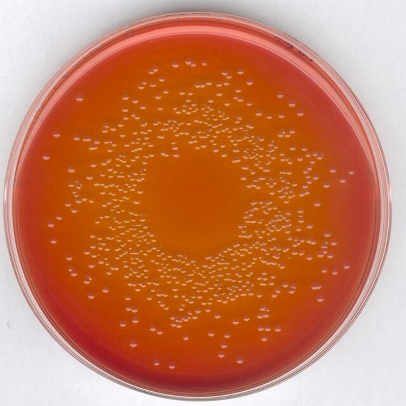 GranuCult®prime MacConkey(MAC)琼脂是一种选择性琼脂培养基,用于从食品链、化妆品、药品和其他材料中分离和确认大肠杆菌和其他肠杆菌科,如沙门氏菌和志贺氏菌。这种培养基含有结晶紫和胆汁盐,它们抑制革兰氏阳性微生物菌群的生长,同时允许革兰氏阴性细菌生长。蛋白胨提供氮、维生素和氨基酸。乳糖和pH指示剂中性红用于检测乳糖降解。乳糖的发酵导致pH值局部下降,导致pH指示剂呈中性红色。由此形成红粉色菌落,菌落周围的培养基颜色变为红色。通常在菌落周围形成胆汁沉淀区。胆汁盐和结晶紫抑制革兰氏阳性菌的生长。琼脂是固化剂。