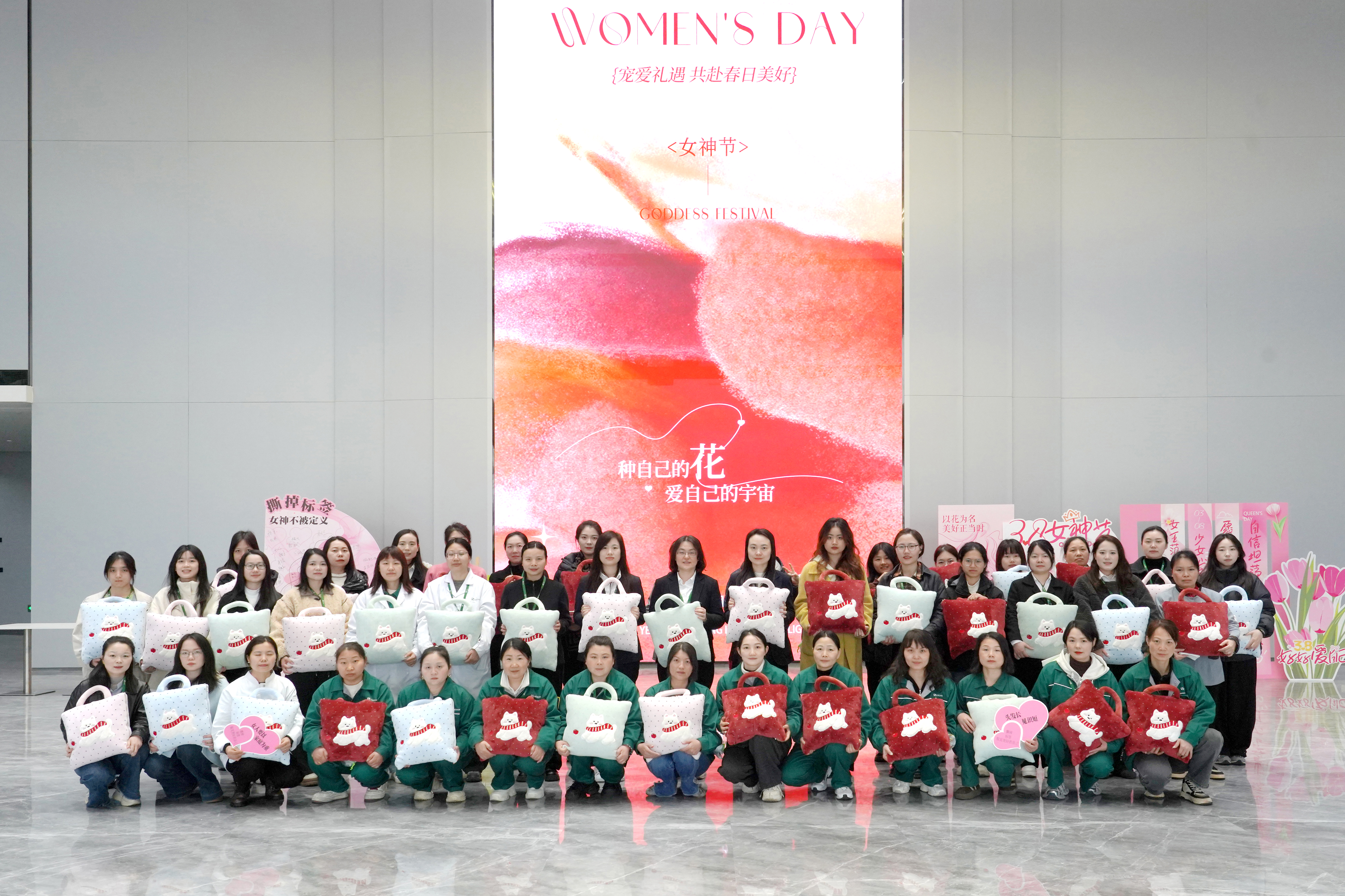 活动最后,全体女员工在LED主屏幕前集合,随着快门声响起,2026年鑫政女神节的全家福被永久记录。